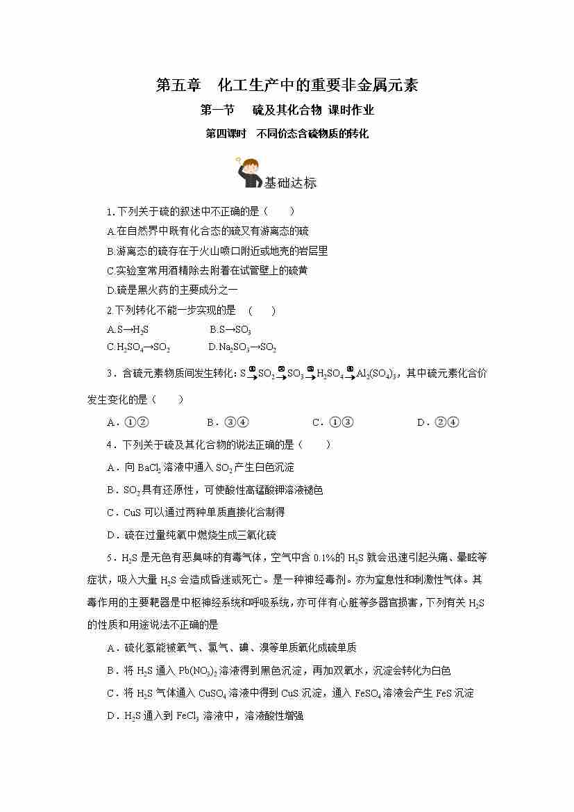 首页 > 全部 > 分层作业 > 5.1.4 硫及其化合物—不同价态含硫物质的转化(分层作业)-(人教版2019必修第二册)(原卷版)