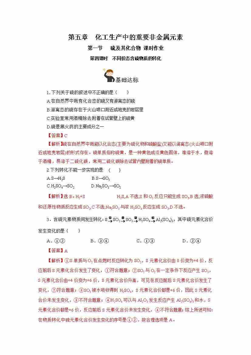首页 > 全部 > 分层作业 > 5.1.4 硫及其化合物—不同价态含硫物质的转化(分层作业)-(人教版2019必修第二册)(解析版)
