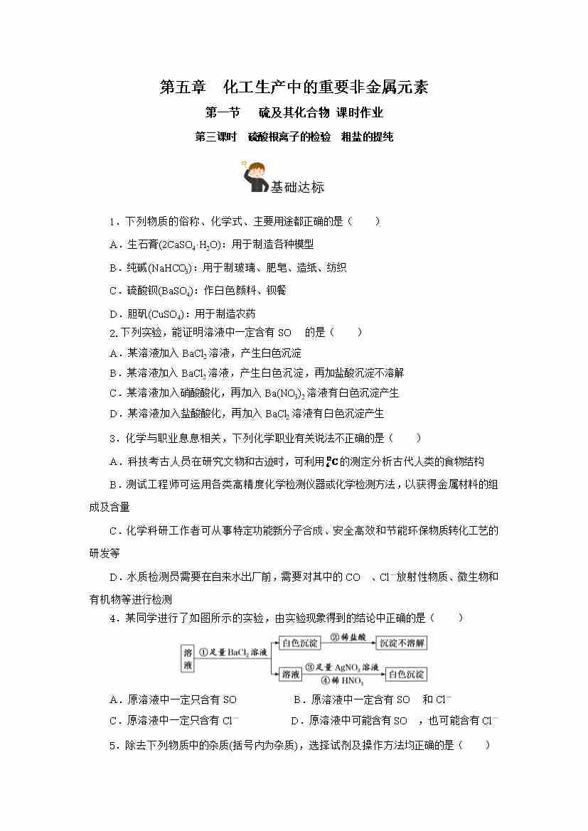 5.1.3 硫及其化合物—硫酸根离子的检验 粗盐的提纯(分层作业)-(人教版2019必修第二册)(原卷板)