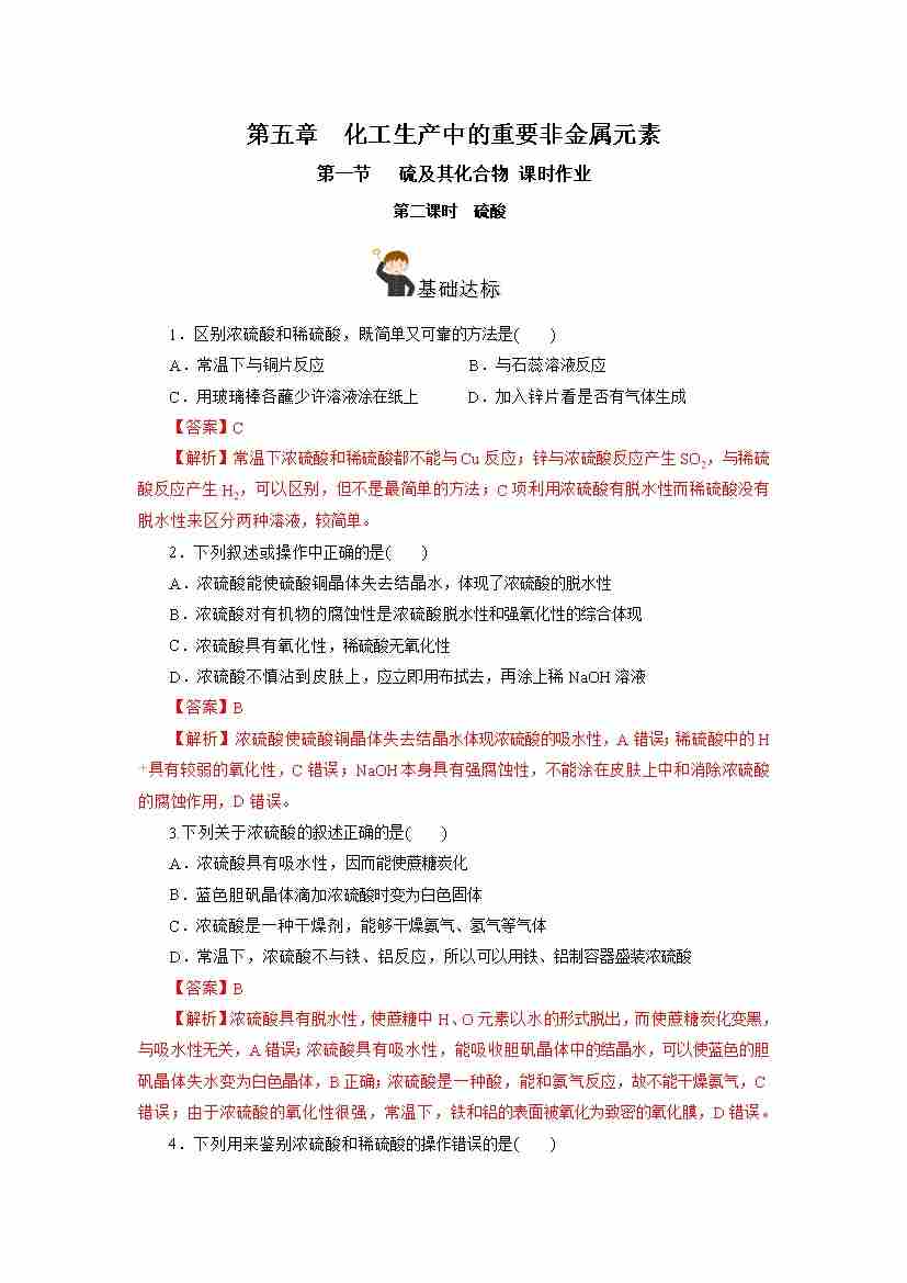 首页 > 全部 > 分层作业 > 5.1.2 硫及其化合物—硫酸(分层作业)-(人教版2019必修第二册)(解析版)