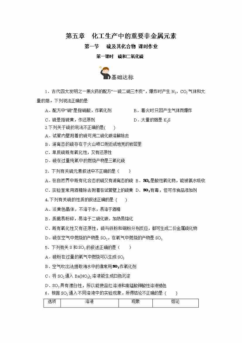 首页 > 全部 > 分层作业 > 5.1.1 硫及其化合物—硫和二氧化硫(分层作业)-(人教版2019必修第二册)(原卷版)
