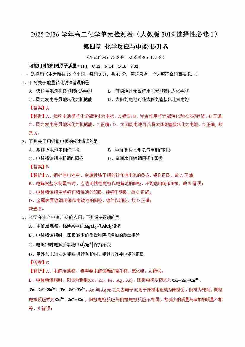 首页 > 全部 > 单元测试 > 第四章 化学反应与电能·提升卷(人教版2019选择性必修1)(教师版)