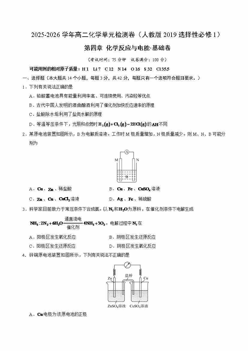 首页 > 全部 > 单元测试 > 第四章 化学反应与电能·基础卷(人教版2019选择性必修1)(考试版A4)