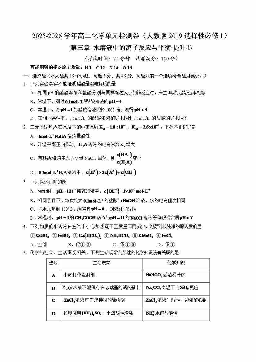 第三章 水溶液中的离子反应与平衡·提升卷(人教版2019选择性必修1)(考试版A4)