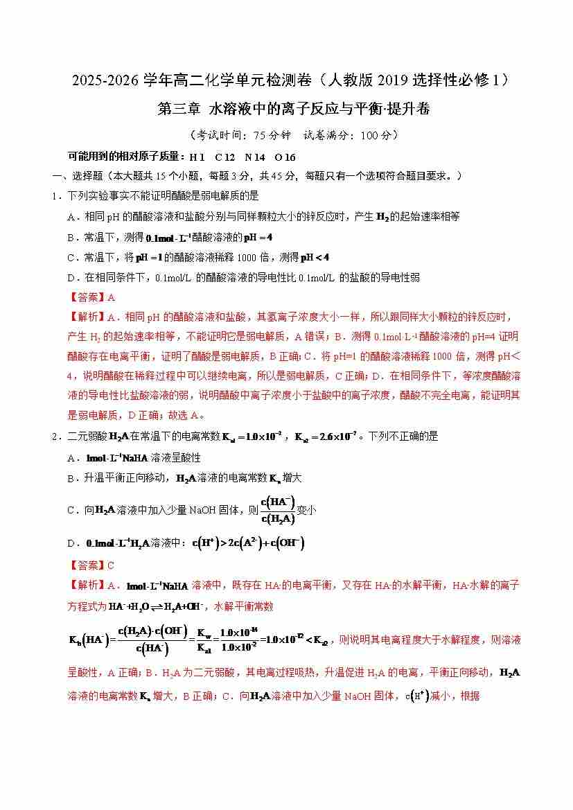 第三章 水溶液中的离子反应与平衡·提升卷(人教版2019选择性必修1)(教师版)