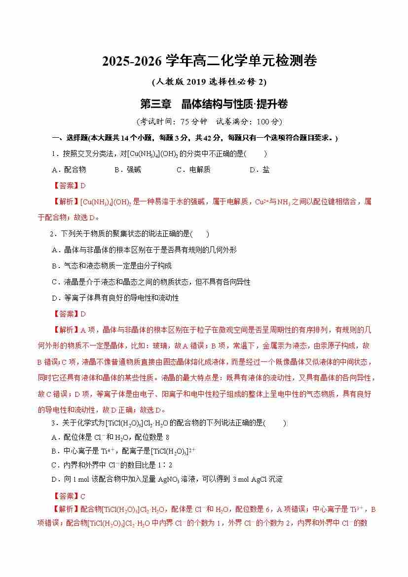 首页 > 全部 > 单元测试 > 第三章 晶体结构与性质·提升卷(人教版2019选择性必修2)(解析版)