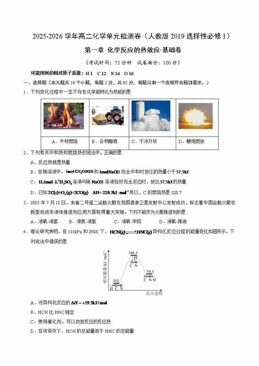 第一章 化学反应的热效应·基础卷(考试版A4)