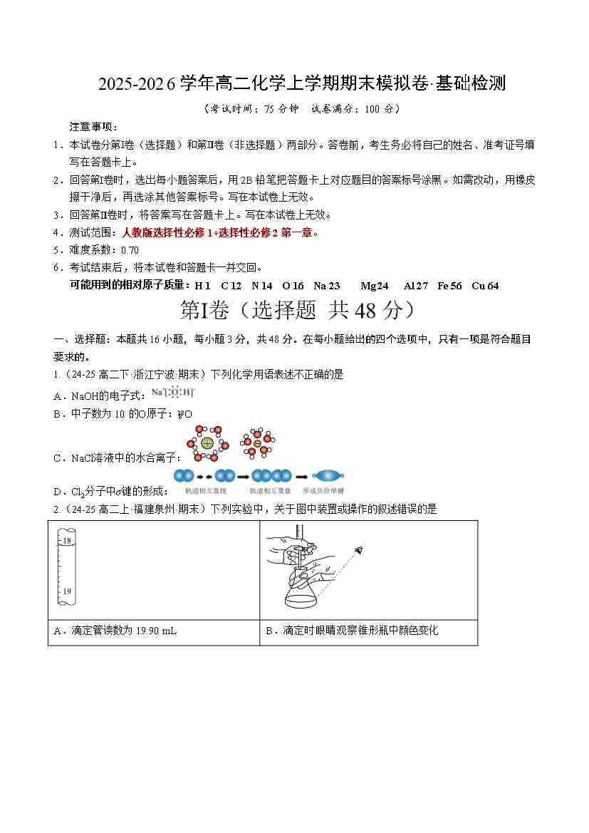 首页 > 全部 > 期末试卷 > 高二化学上学期期末模拟卷·基础检测(人教版)(考试版A4)