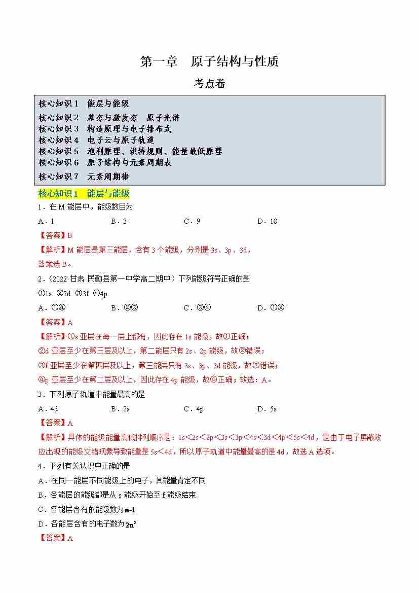 首页 > 全部 > 单元测试 > 第一章 原子结构与性质【单元测试·考点卷】-(人教版2019选择性必修2)(解析版)