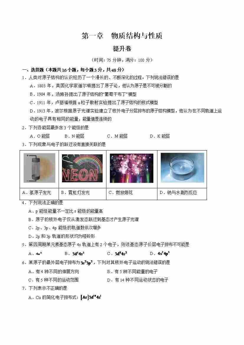 首页 > 全部 > 单元测试 > 第一章 原子结构与性质【单元测试·提升卷】-(人教版2019选择性必修2)(原卷版)