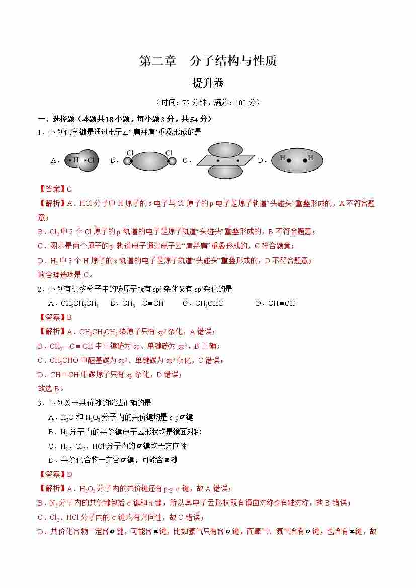 首页 > 全部 > 单元测试 > 第二章 分子结构与性质【单元测试·提升卷】-(人教版2019选择性必修2)(解析版)