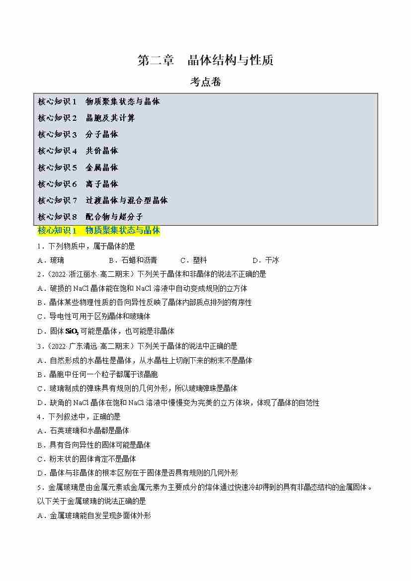 首页 > 全部 > 单元测试 > 第三章 晶体结构与性质【单元测试·考点卷】-(人教版2019选择性必修2)(原卷版)