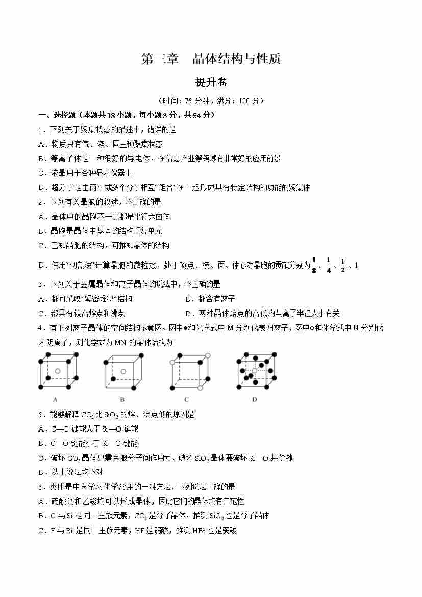 首页 > 全部 > 单元测试 > 第三章 晶体结构与性质【单元测试·提升卷】-(人教版2019选择性必修2)(原卷版)