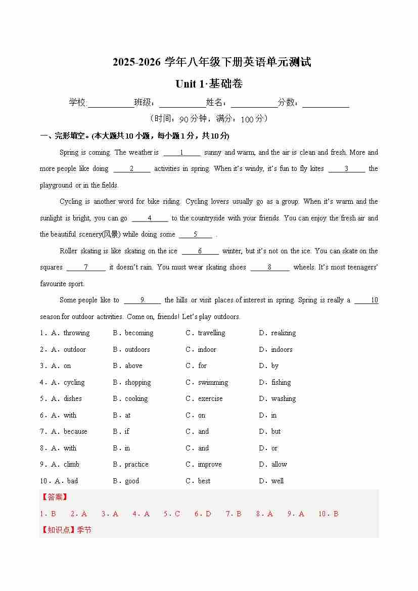八年级英语下册 Unit 1 单元自测·基础卷(解析版)