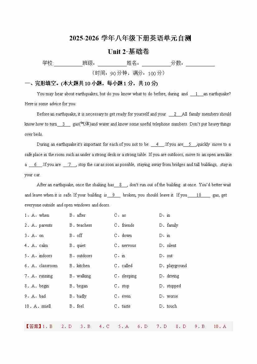 首页 > 全部 > 单元基础卷 > 八年级英语下册Unit 2 单元自测·基础卷(解析版)