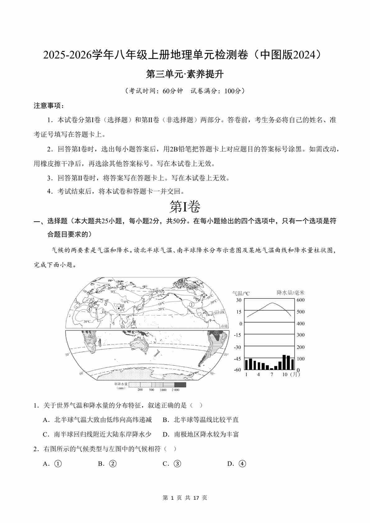 首页 > 全部 > 单元测试 > 第3章 世界气候(单元测试·提升卷)(解析版)