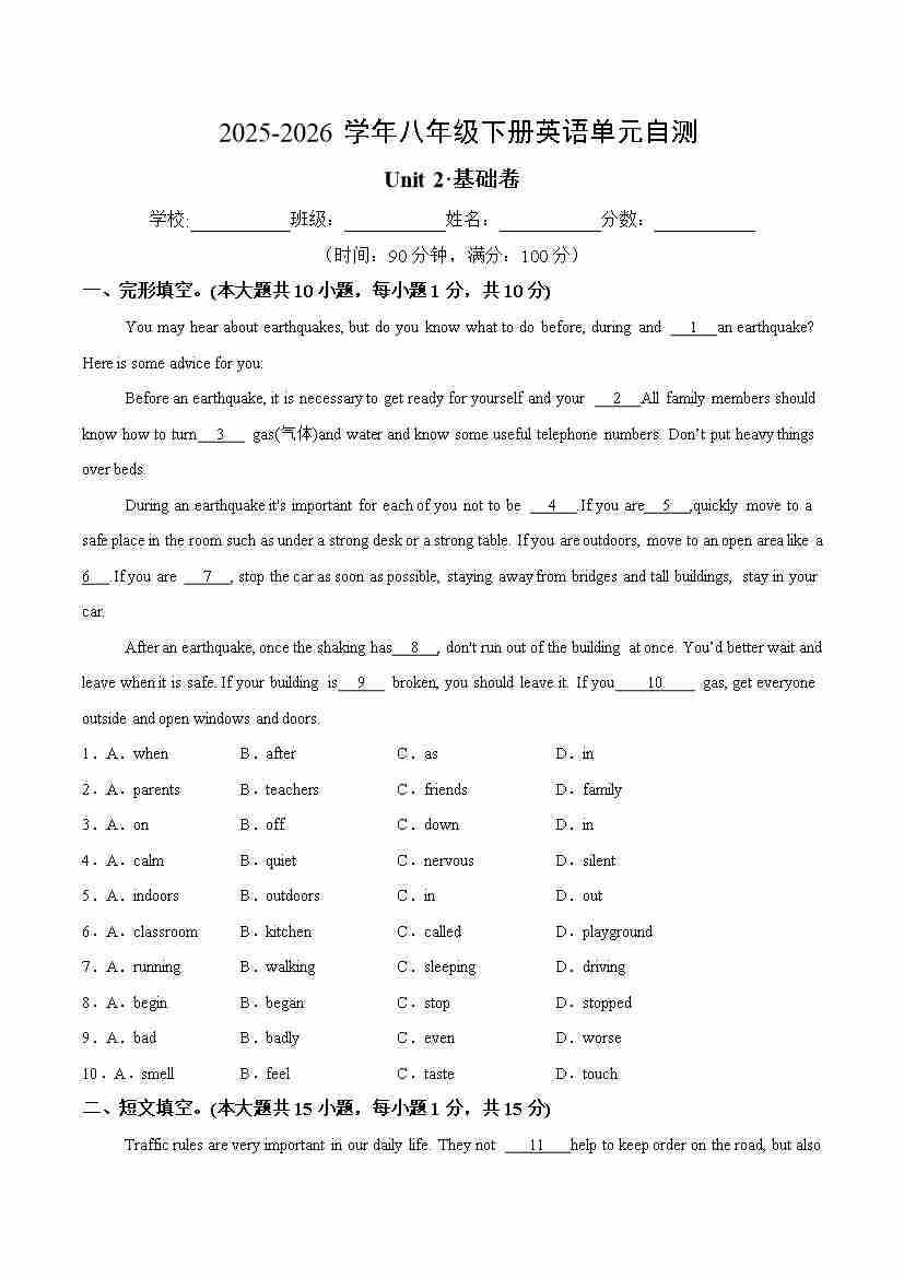 首页 > 全部 > 单元基础卷 > 八年级英语下册Unit 2 单元自测·基础卷(试题版)