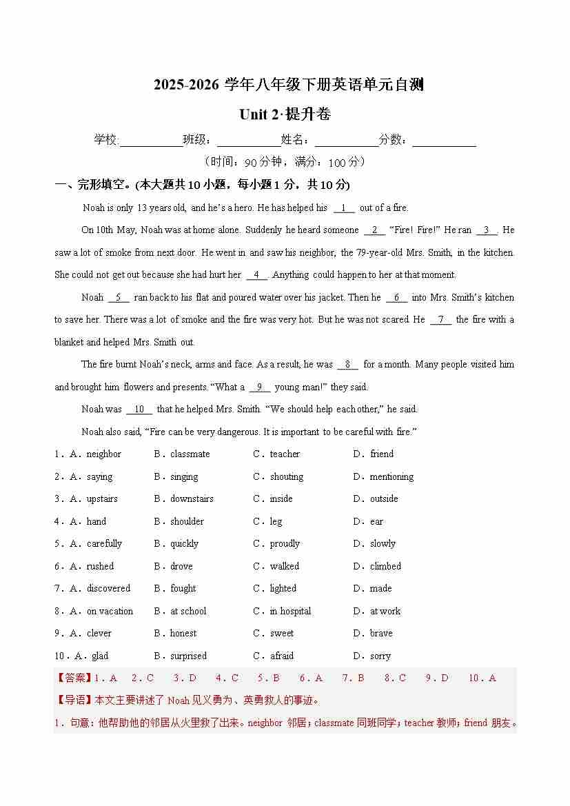 八年级英语下册 Unit 2 单元自测·提升卷(解析版)