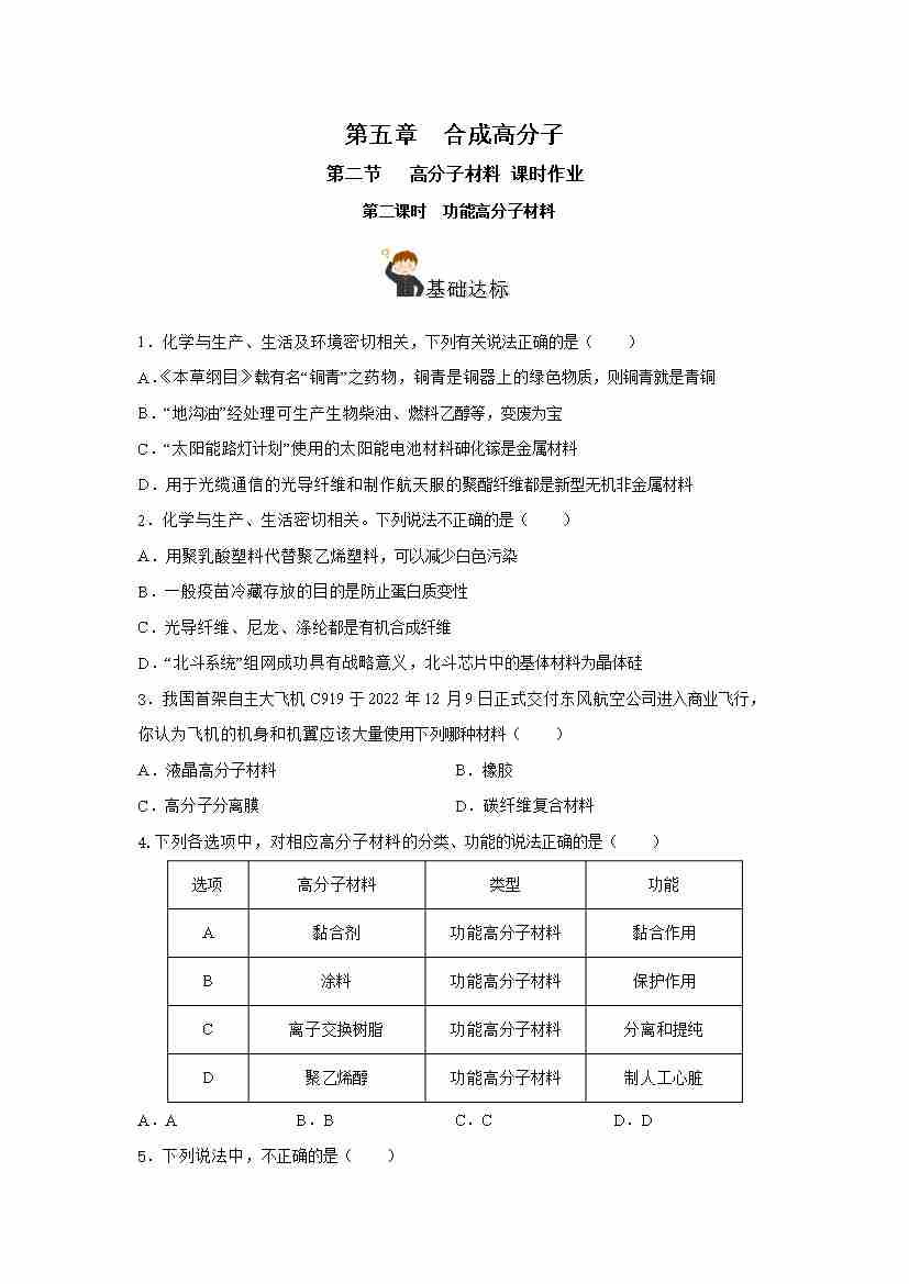 首页 > 全部 > 分层作业 > 5.2.2 高分子材料— 功能高分子材料(分层作业)(原卷版)