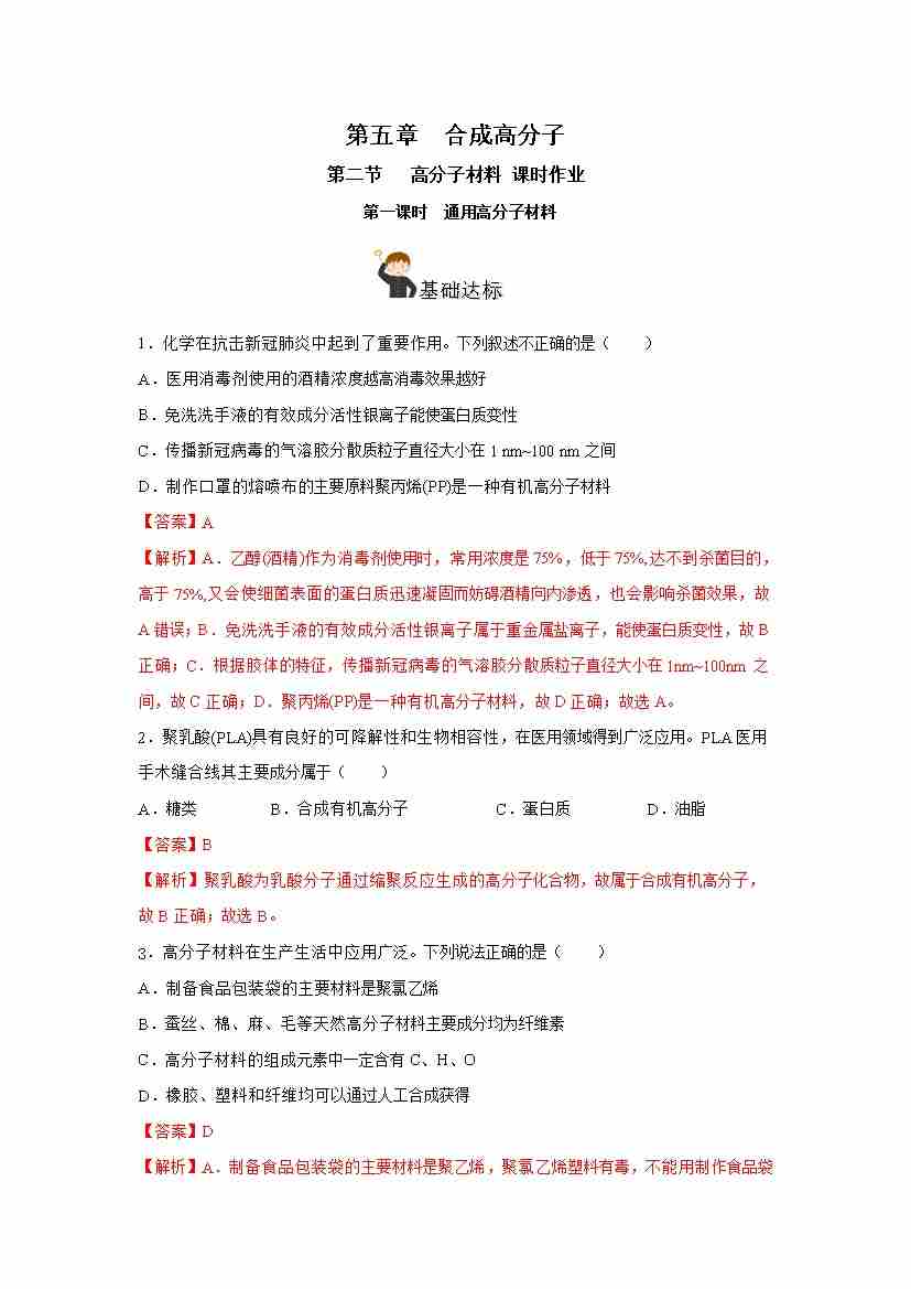 首页 > 全部 > 分层作业 > 5.2.1 高分子材料— 通用高分子材料(分层作业)(解析版)