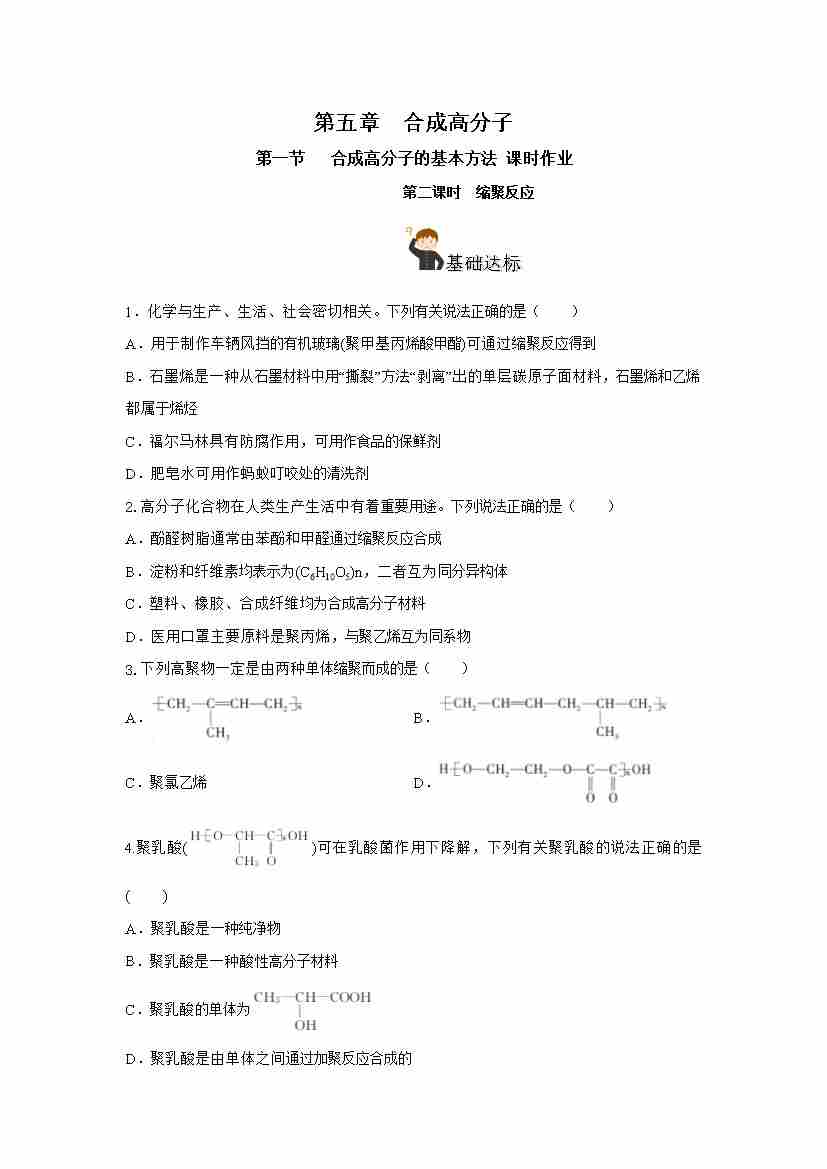 首页 > 全部 > 分层作业 > 5.1.2 合成高分子的基本方法— 缩聚反应(分层作业)(原卷版)