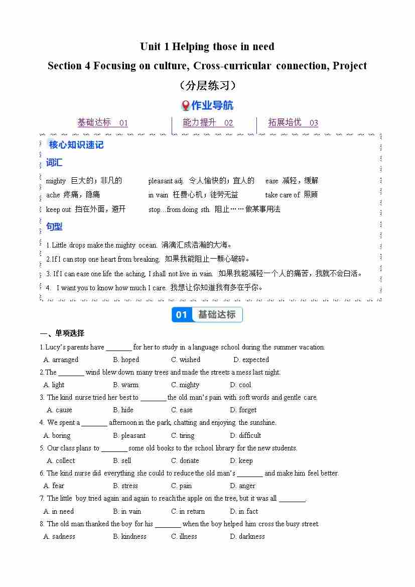 Unit 1 课时5 Section 4 Focusing on culture,Cross-curricular connection,Project(分层作业)(原卷版)
