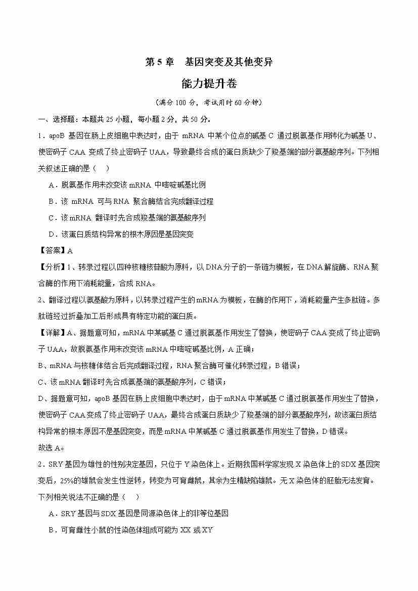 首页 > 全部 > 单元试卷 > 第5章 基因突变及其他变异 (单元测试·提升卷)(教师版)
