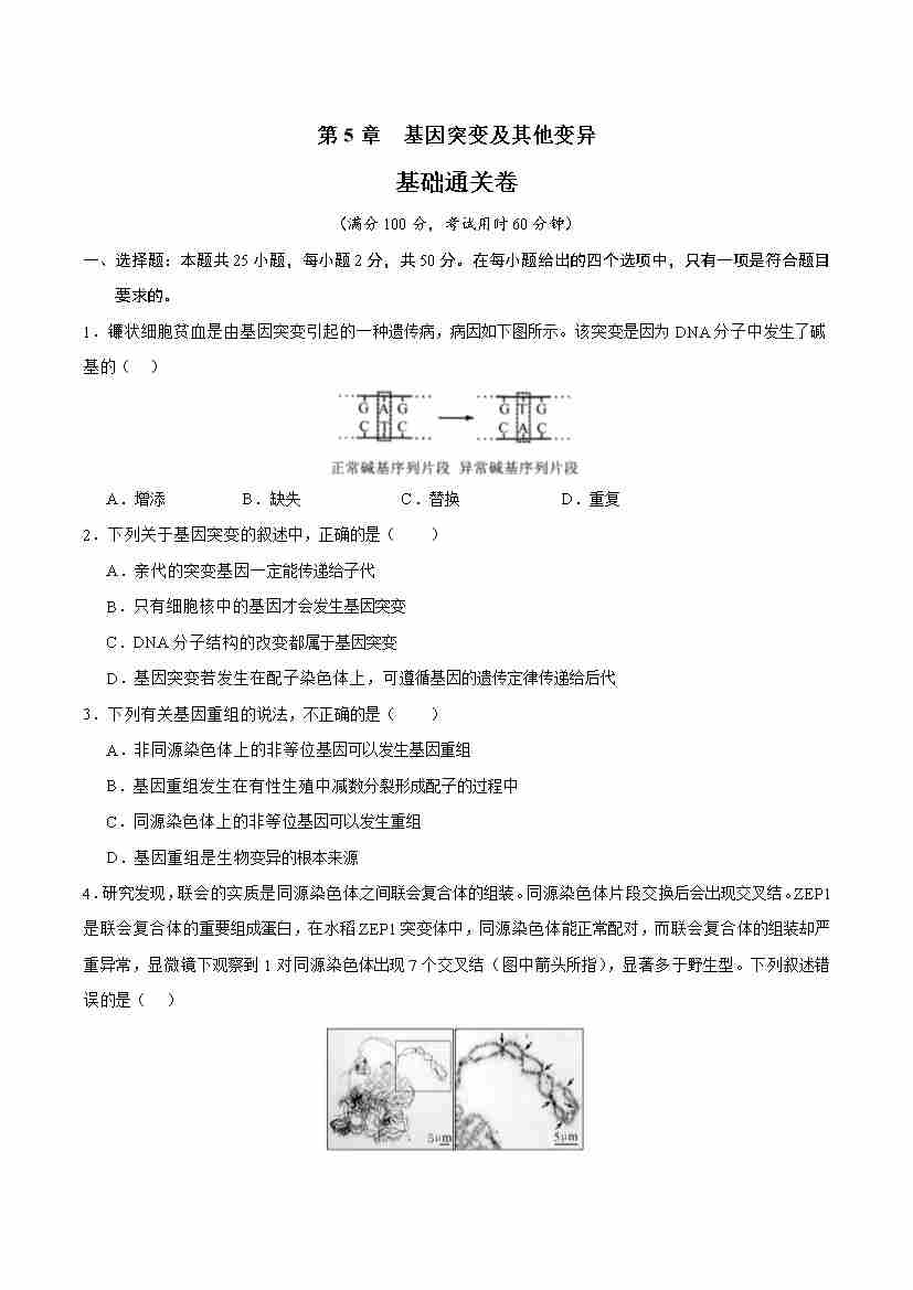 第5章 基因突变及其他变异 (单元测试·基础卷)(学生版)