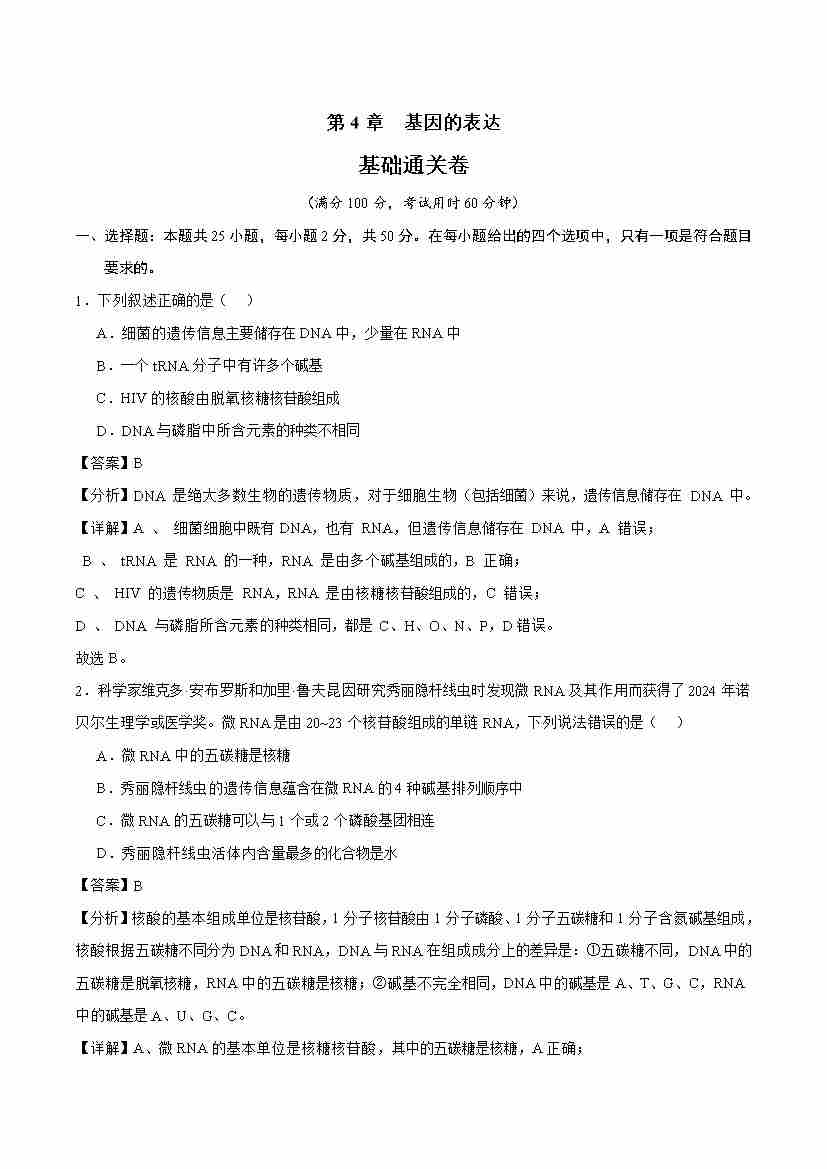 第4章 基因的表达(单元测试·基础卷)(教师版)