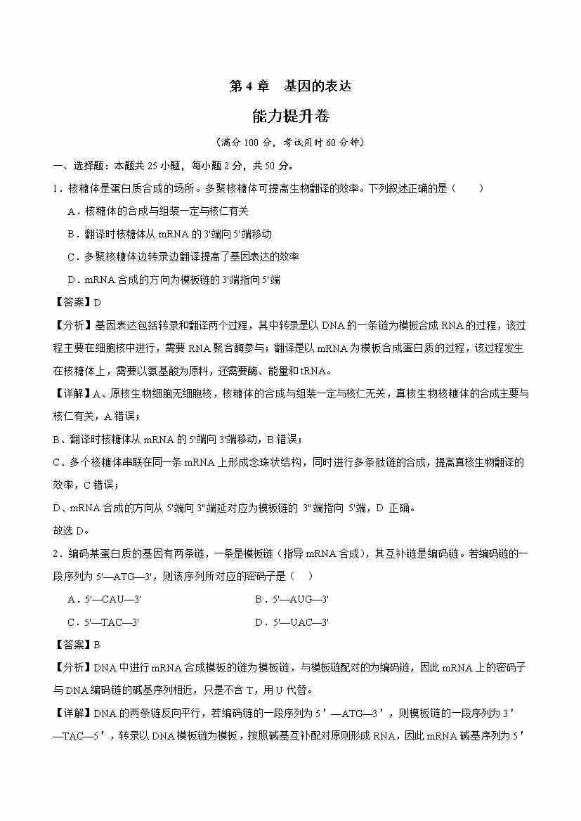 首页 > 全部 > 单元试卷 > 第4章 基因的表达(单元测试·提升卷)(教师版)