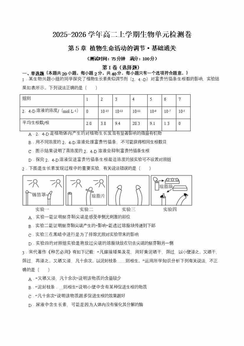 首页 > 全部 > 单元试卷 > 第5章 植物生命活动的调节(单元测试·基础卷)(学生版)