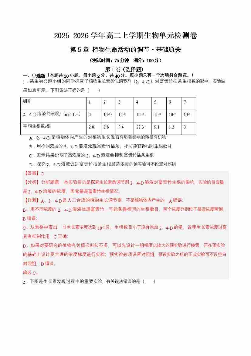 首页 > 全部 > 单元试卷 > 第5章 植物生命活动的调节(单元测试·基础卷)(教师版)