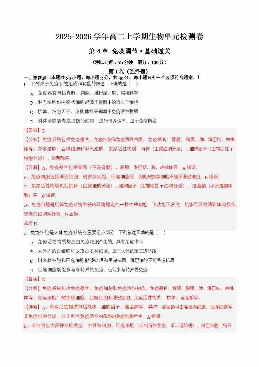 第4章 免疫调节(单元测试·基础卷)(教师版)