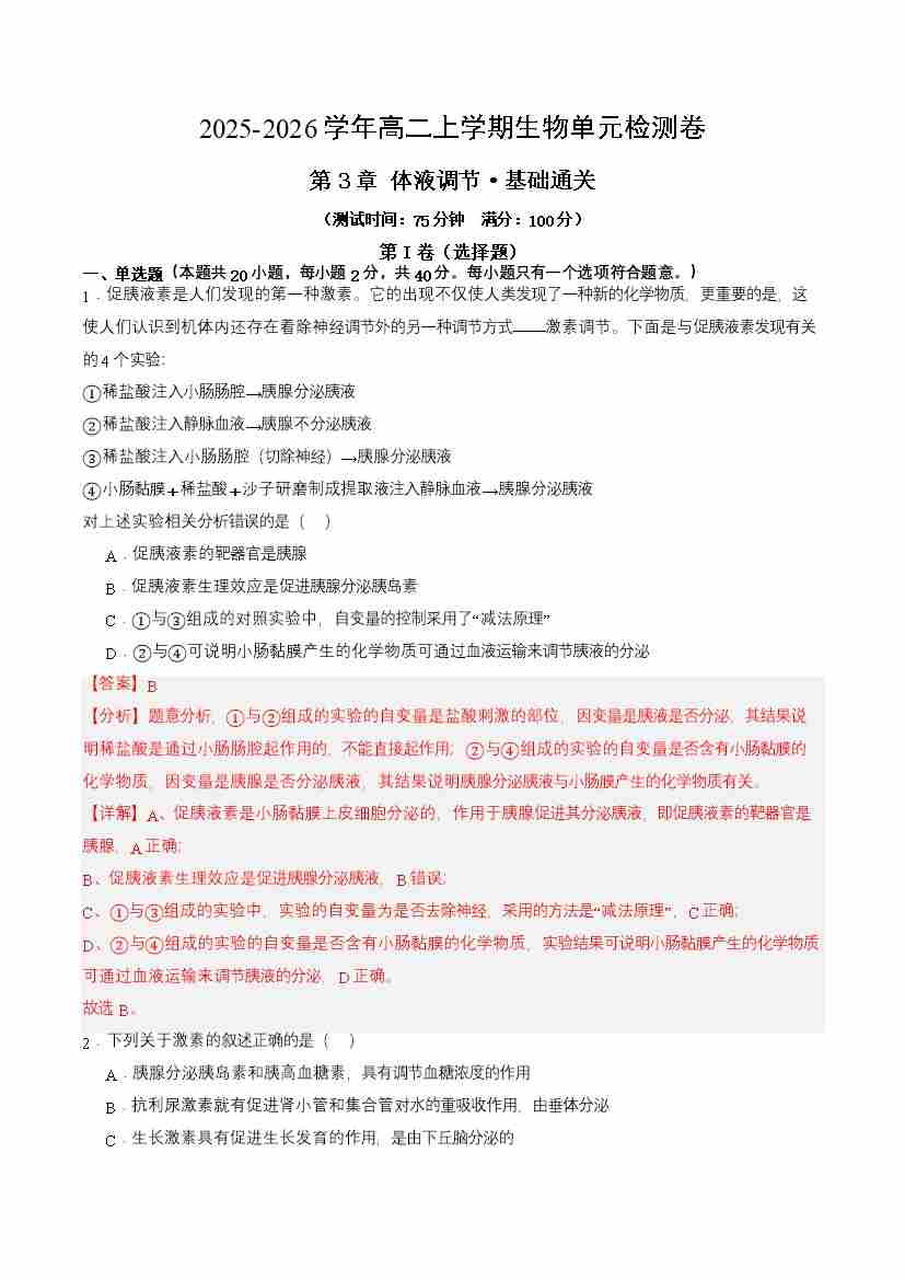 首页 > 全部 > 单元试卷 > 第3章 体液调节(单元测试·基础卷)(教师版)