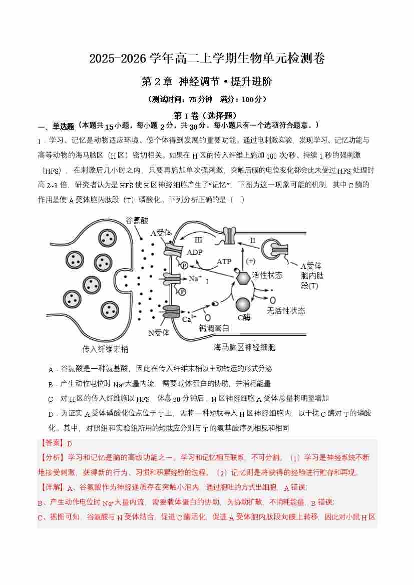 首页 > 全部 > 单元试卷 > 第2章 神经调节(单元测试·提升卷)(教师版)