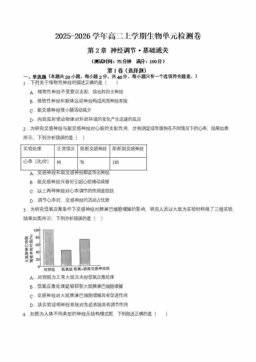 首页 > 全部 > 单元试卷 > 第2章 神经调节(单元测试·基础卷)(学生版)
