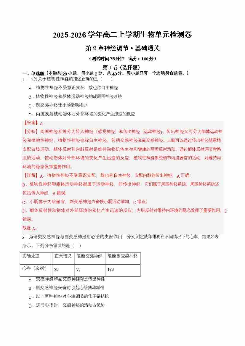首页 > 全部 > 单元试卷 > 第2章 神经调节(单元测试·基础卷)(教师版)