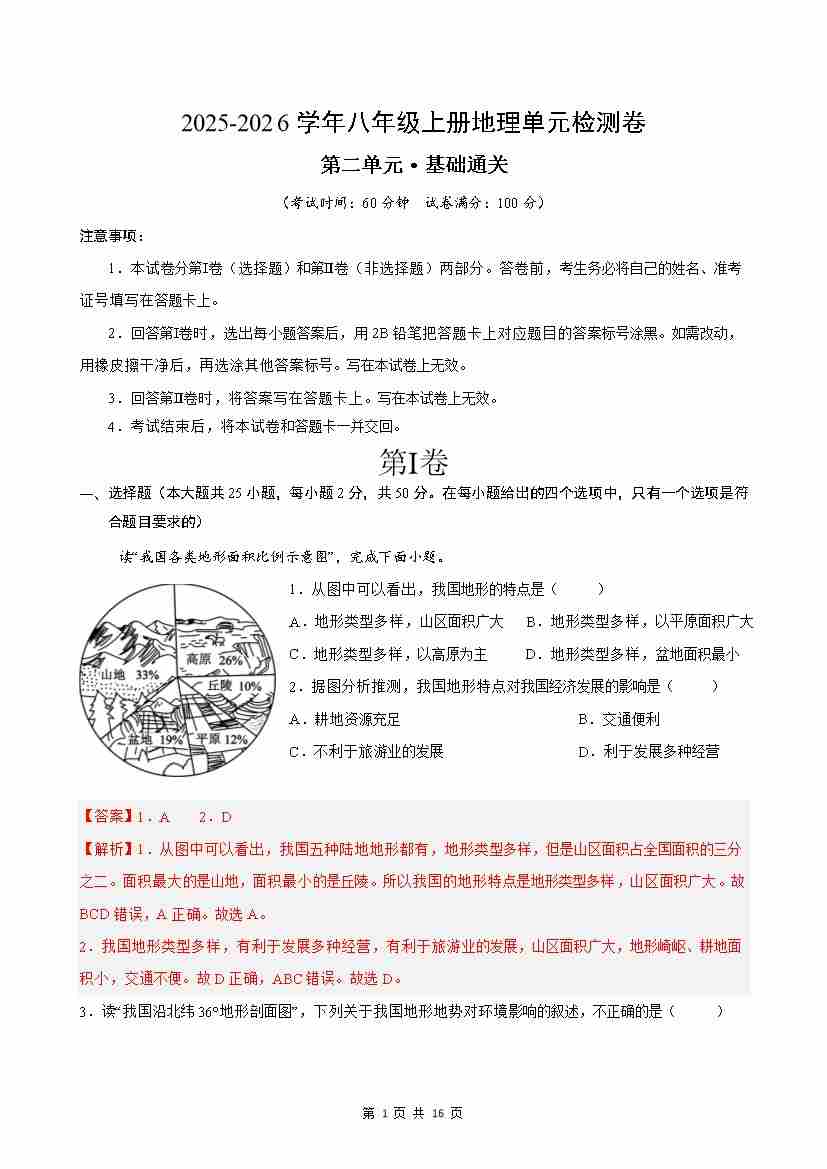首页 > 全部 > 单元基础卷 > 八上地理 第2章测试·基础卷(详解版)