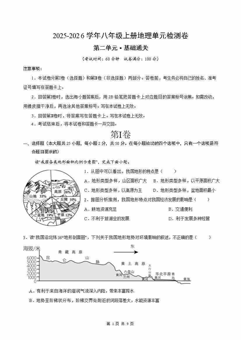 八上地理 第2章测试·基础卷(考试版A4)