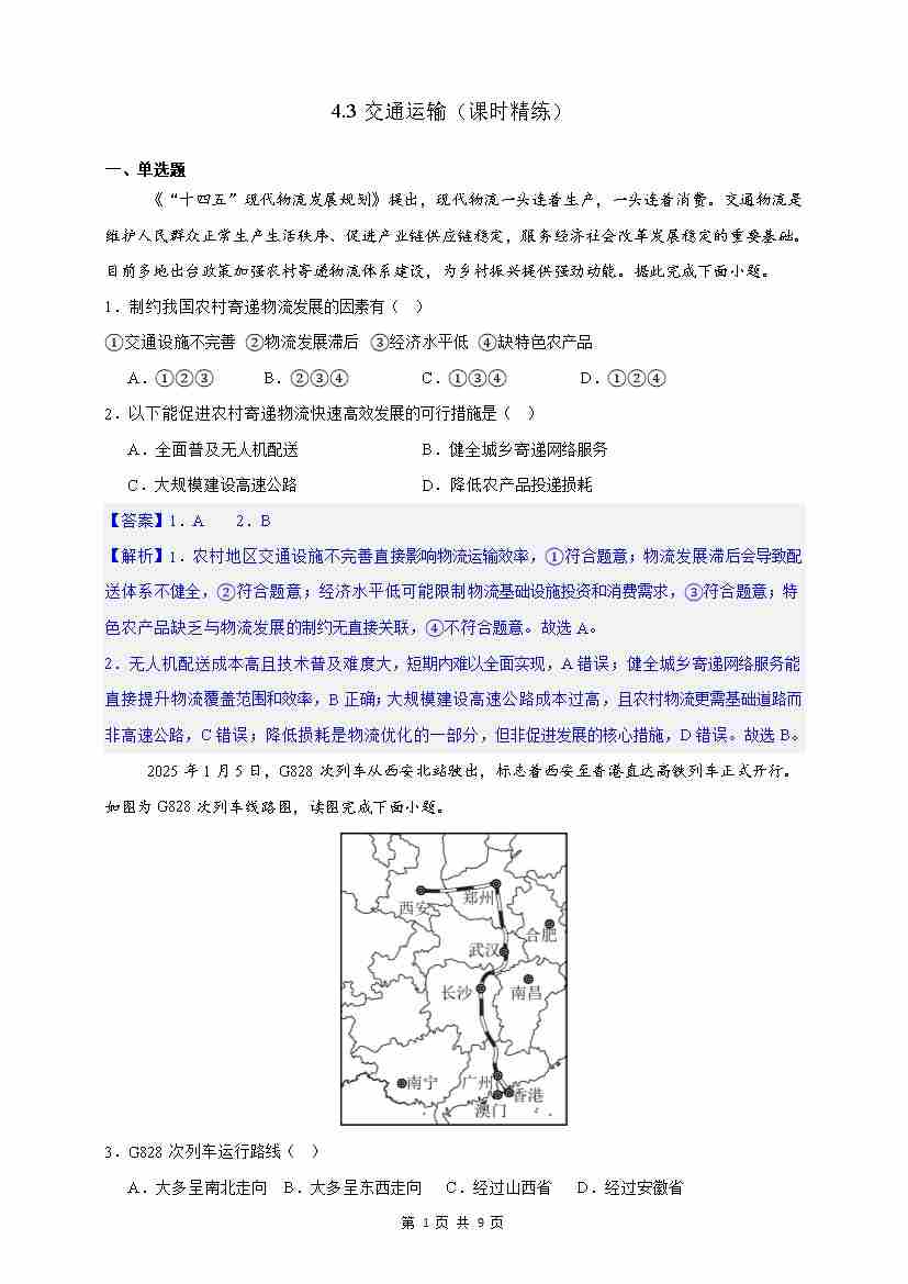 首页 > 全部 > 同步作业 > 【情境·素养】4.3交通运输 课时精练(解析)-2025~2026学年人教版(2024版)