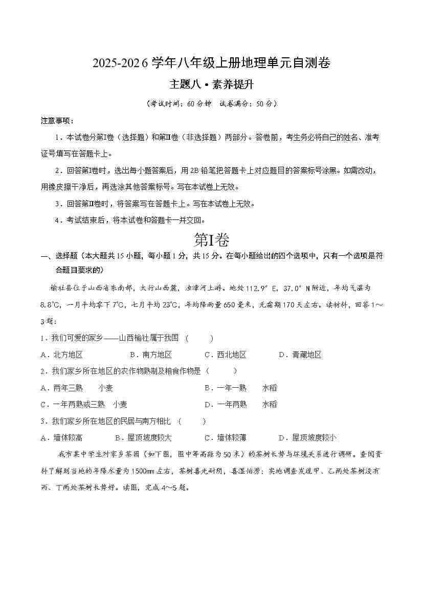 首页 > 全部 > 单元提升卷 > 八下地理主题八测试·提升卷(考试版A4)