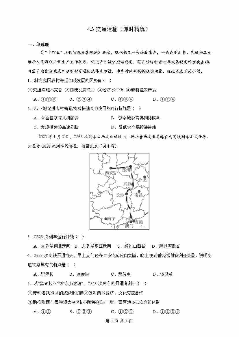 首页 > 全部 > 同步作业 > 【情境·素养】4.3交通运输 课时精练(原题)-2025~2026学年人教版(2024版)