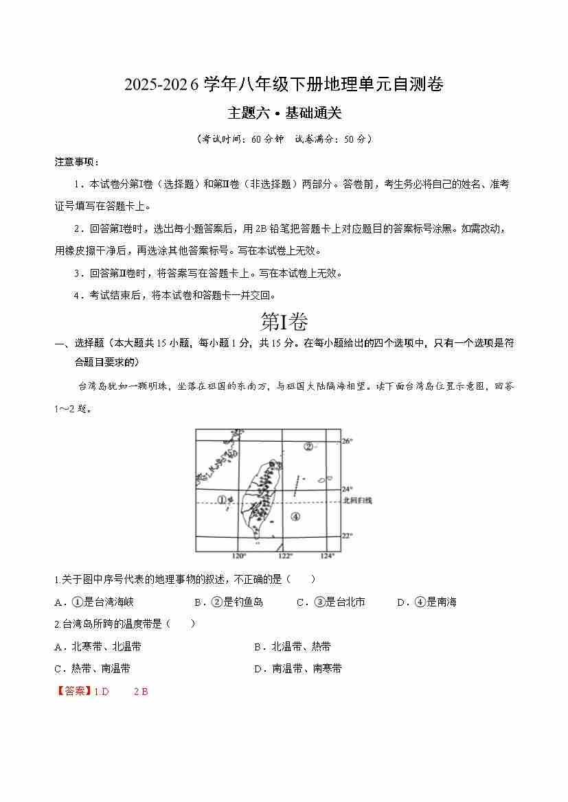 首页 > 全部 > 单元基础卷 > 八下地理主题六测试·基础卷(解析版)