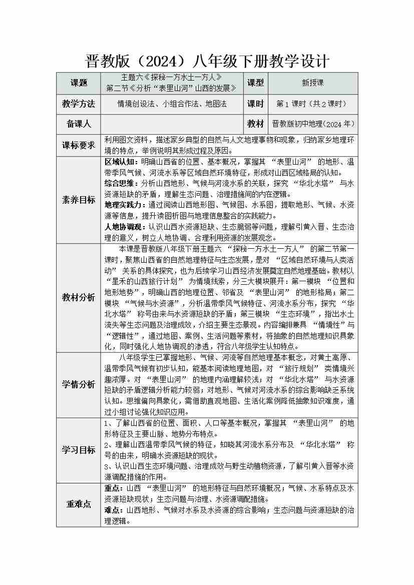 6.2 分析“表里山河”山西的发展 第1课时(教学设计)