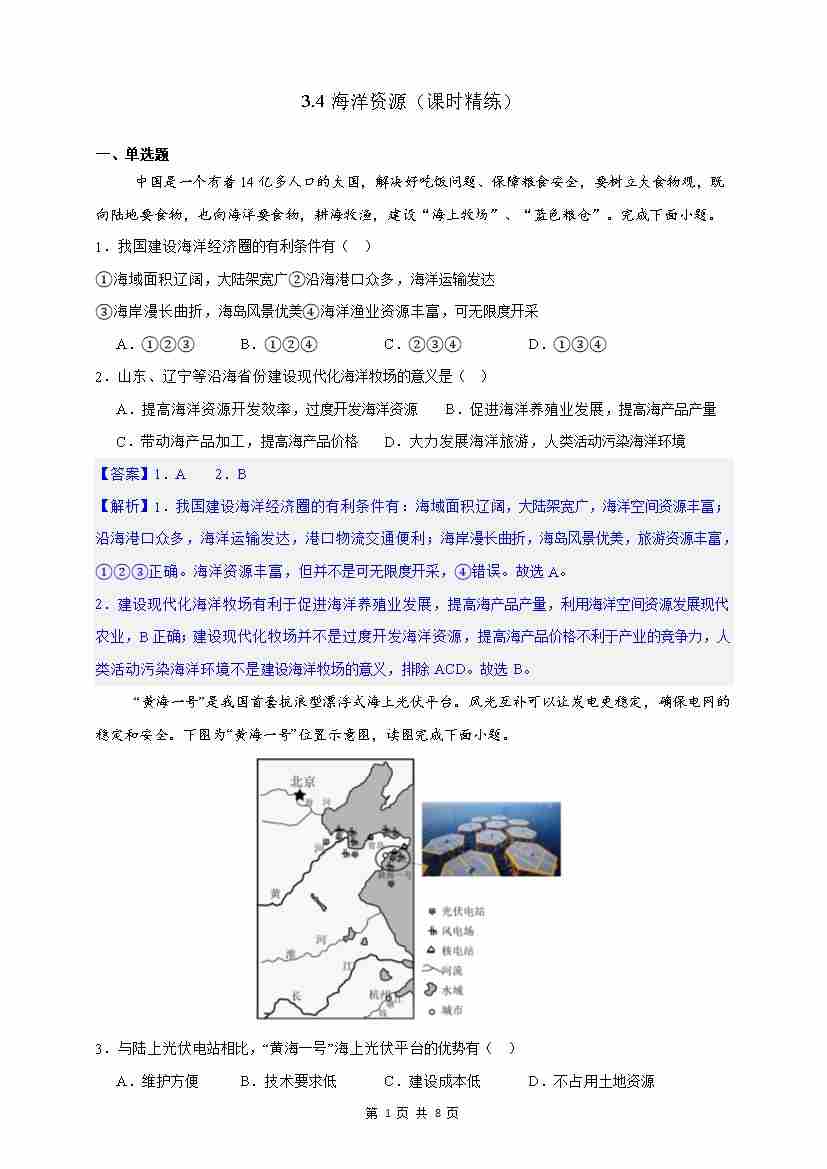 首页 > 全部 > 同步作业 > 【情境·素养】3.4海洋资源 课时精练(解析)-2025~2026学年人教版(2024版)---人教版