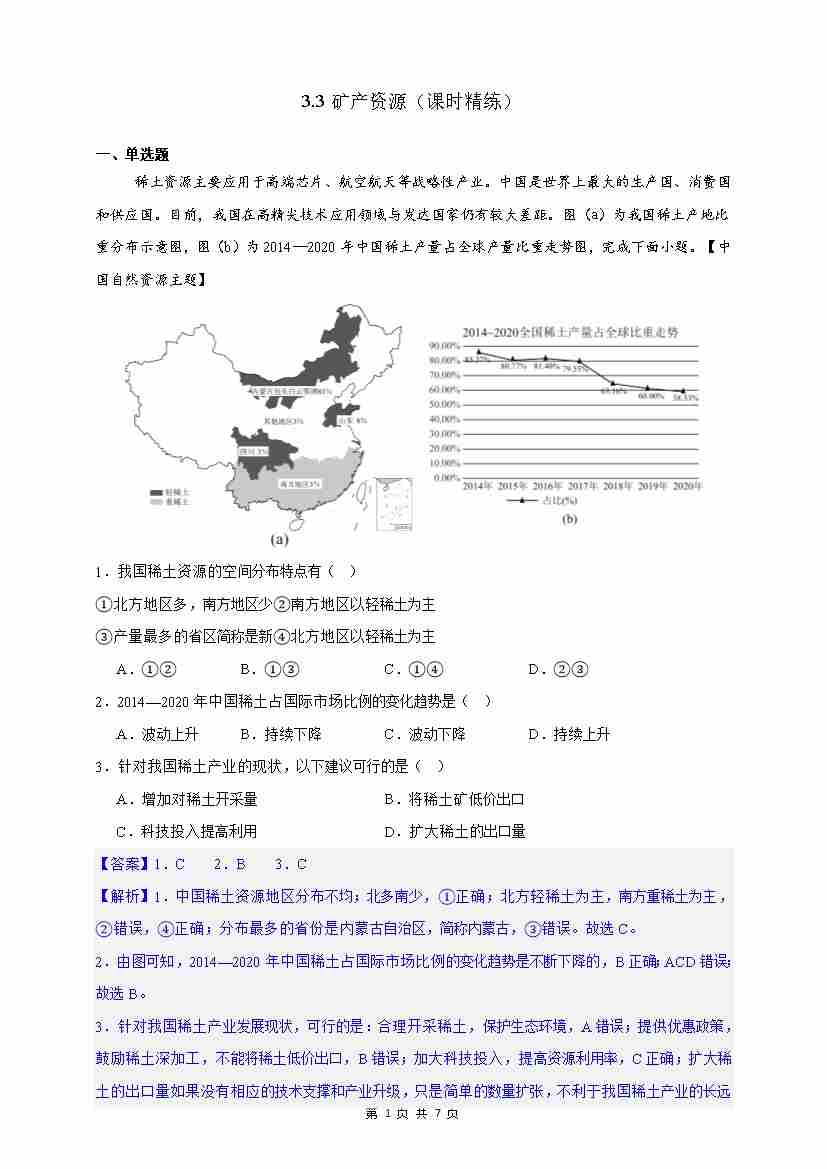 首页 > 全部 > 同步作业 > 【情境·素养】3.3矿产资源 课时精练(解析)-2025~2026学年人教版(2024版)---人教版