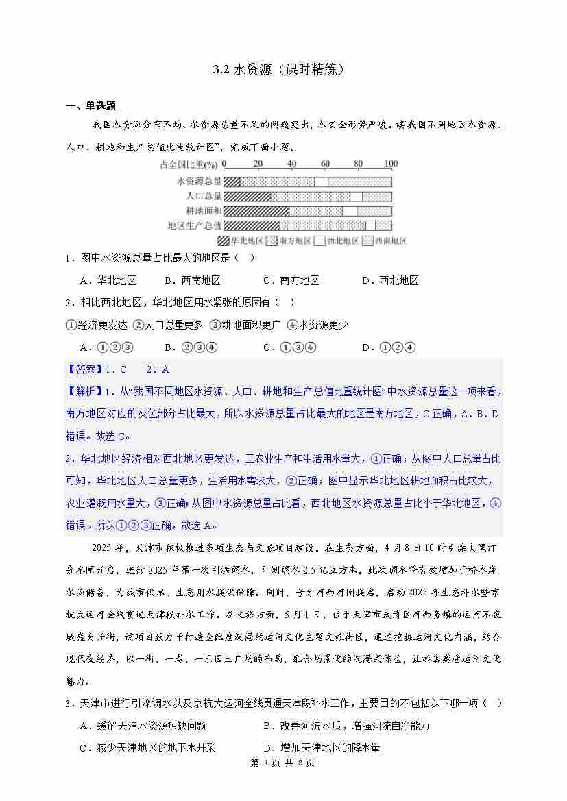 【情境·素养】3.2水资源 课时精练(解析)-2025~2026学年人教版(2024版)---人教版