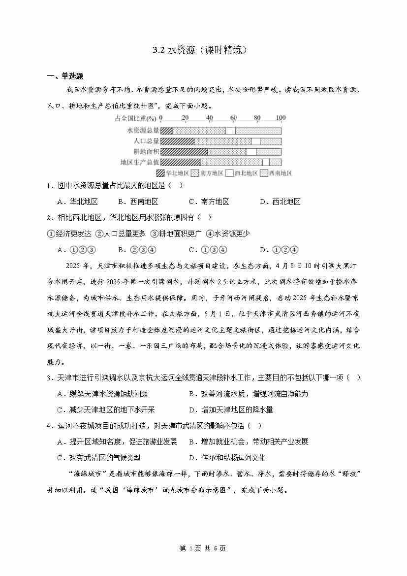 【情境·素养】3.2水资源 课时精练(原题)-2025~2026学年人教版(2024版)---人教版