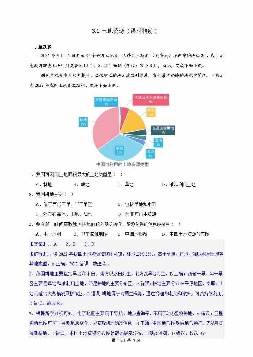 首页 > 全部 > 同步作业 > 【情境·素养】3.1土地资源 课时精练(解析)-2025~2026学年人教版(2024版)---人教版