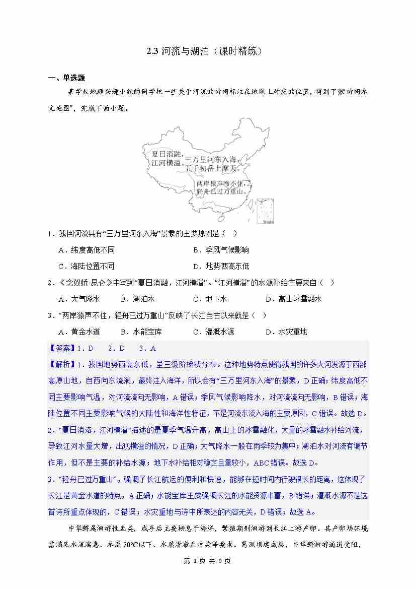 【情境·素养】2.3河流与湖泊 课时精练(解析)-2025~2026学年人教版(2024版)---人教版